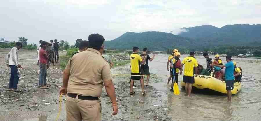देहरादून: आज दिनांक 03/07/2025 को चौकी डाकपत्थर को स्थानीय व्यक्तियों द्वारा सूचना दी गई कि अशोक आश्रम डुमेट के सामने यमुना नदी में एक टापू में कुछ पुरुष तथा महिलाएं फंसे गये है, जिस पर तत्काल पुलिस बल मय आपदा उपकरण के साथ एसडीआरएफ टीम व जल पुलिस के साथ मौके पर पहुंचा, जहां कुछ लोग टापू में फंसे हुए थे, जिस पर पुलिस, एस0डी0आर0एफ0 व जल पुलिस द्वारा तत्काल रेस्क्यू अभियान चलाते हुए टापू में फंसे 11 व्यक्तियो(07 पुरूष व 04 महिला) को सकुशल बाहर निकाला गया। रेस्क्यू किये गये व्यक्तियो द्वारा बताया गया कि वह मजदूरी का कार्य करते है तथा वह सभी सुबह नदी में गए थे, अचानक जलस्तर बढने लगा, जिस कारण वह सभी एक टापू में इकट्ठे हो गए, टापू के चारों तरफ पानी होने की वजह से बाहर नहीं आ पाए। रेस्क्यू किये गये सभी व्यक्तियों द्वारा पुलिस द्वारा की गई त्वरित कार्यवाही की प्रशंसा कर उत्तराखण्ड पुलिस का आभार व्यक्त किया गया।